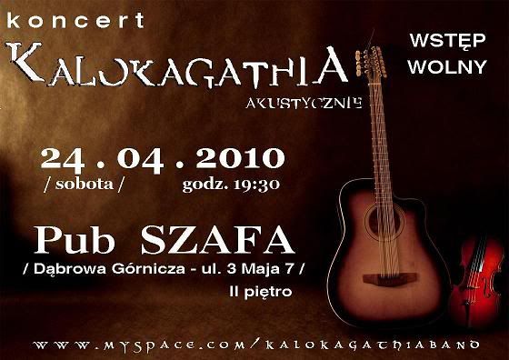 Gorąco zapraszamy na kolejny koncert akustyczny zespołu KALOKAGATHIA ( http://www.myspace.com/kalokagathiaband ) w Pubie SZAFA w Dąbrowie Górniczej (ul. 3 Maja 7 - II piętro) w sobotę 24.04.2010 o godzinie 19:30. Wstęp wolny!!!