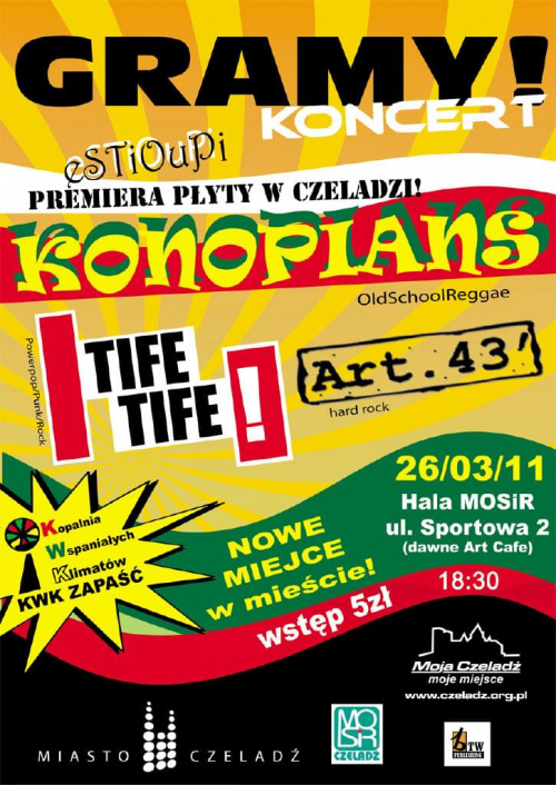 Już w sobotę 26 marca od godziny 18:30 w czeladzkiej Hali Jubileuszowej przy ulicy Sportowej 2 rozlegną się pozytywne dźwięki OldSchoolReggae z długo wyczekiwanej nowej płyty zagłębiowskiego zespołu KoNoPiAnS. Choć od premiery minęło już blisko 2 miesiące, płyta ciągle nie doczekała się swojej premiery w rodzimej Czeladzi. Dla przybyłych zabrzmią nie tylko nowe piosenki, ale i stare hity z których słynie zespół Konopians. Nowa płyta zawiera 12 utworów, godzinę muzyki i jak sam lider zespołu Marcin "Cozer" Markiewicz przyznaje na płycie pojawia się epika, liryka, dramat czyli "Cozer" po polsku. Płyta zebrała pozytywne recenzje wobec tego można spokojnie zaprosić na koncert osoby słuchające nie tylko muzyki ska i reggae bowiem pozytywne wibracje i uśmiech na każdej twarzy są wręcz gwarantowane.